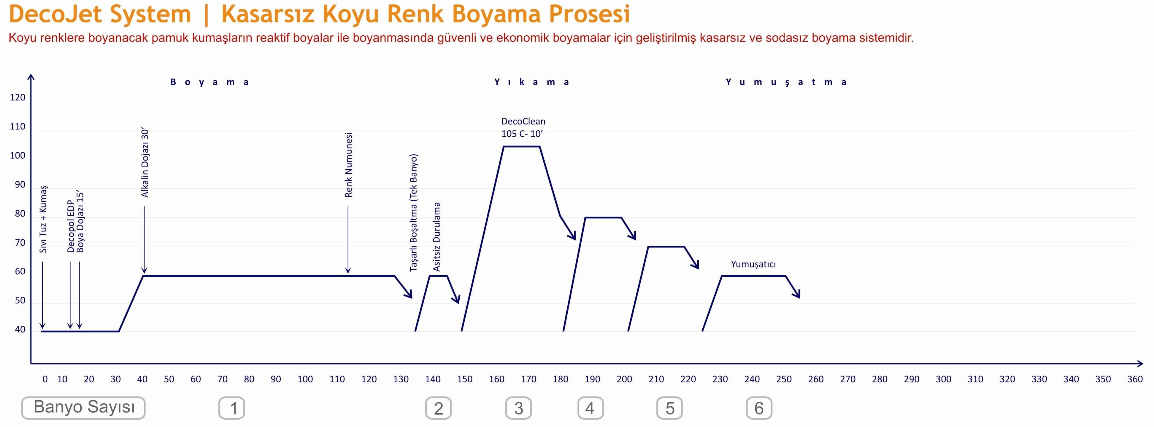 Decojet Sisteminde, ham kumaşa Decopol EDP verildikten sonra boyama başlanır. Hiçbir ek kimyasal kullanmadan ortama tuz ve boya verilmesine başlanmaktadır.